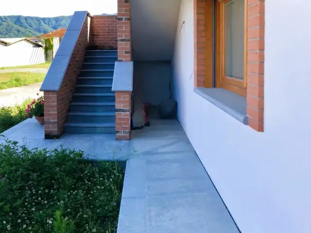marciapiedi, davanzali, soglie e balconi in pietra di Luserna · cornici in mattoni fatti a mano · tetto in legno di abete · serramenti in rovere lamellare con tendine frangiluce integrate · avvolgibili Griesser (Svizzera) · cappotto termico · VMC (ventilazione meccanica controllata) · riscaldamento a pavimento gestibile in domotica zona giorno/notte · predisposizioni complete per domotica, filodiffusione, antintrusione, fotovoltaico/solare termico e gas.